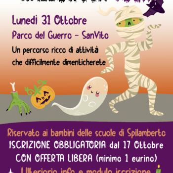 A seguito del grande successo dello scorso anno, anche quest’anno abbiamo deciso di utilizzare lo stesso format 2021 riproponendo “Halloween Tour”, il percorso realizzato all’interno del parco del Guerro a San Vito che prevede una serie di soste dove i bambini dovranno svolgere una breve attività per ricevere il dolce compenso.