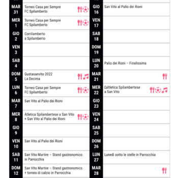 Potete trovare qui il calendario degli eventi programmati ma vi consigliamo di seguire le nostre pagine social per avere tutte le informazioni più dettagliate e per rimanere aggiornato su tutte le sorprese che la Pol. vi sta preparando.